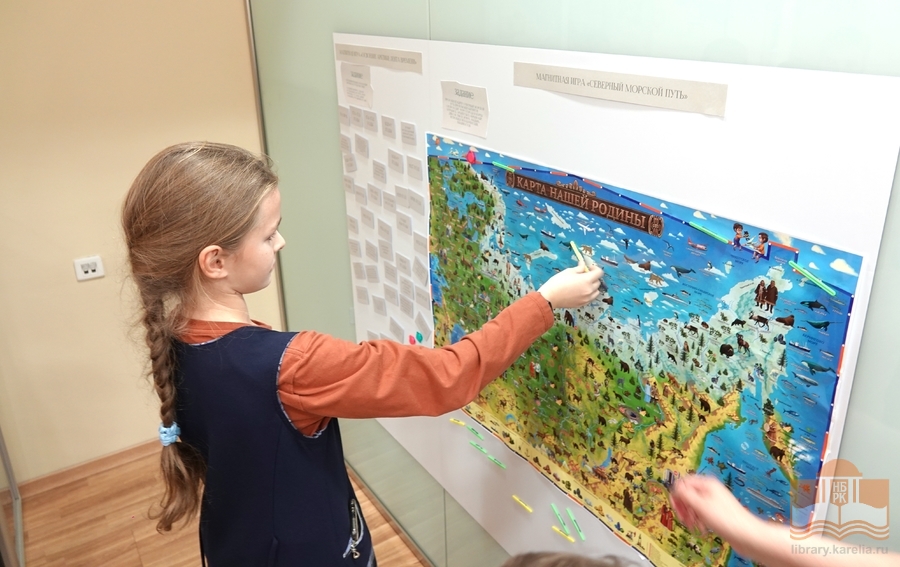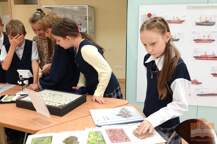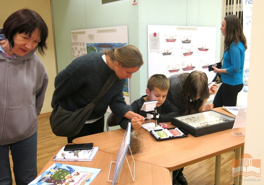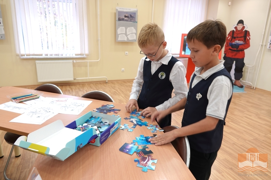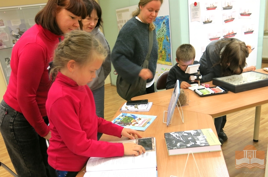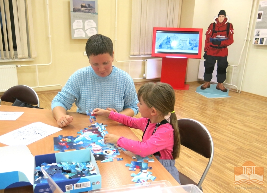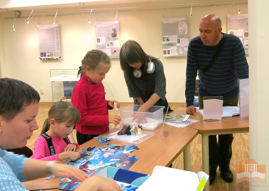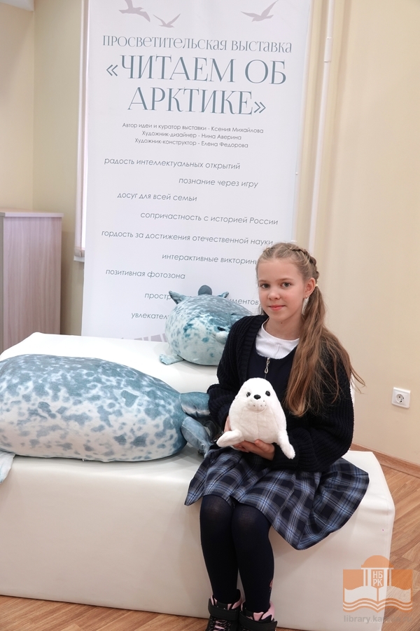 Просветительская выставка «Читаем об Арктике», открывшаяся в Национальной библиотеке 9 октября активно посещается читателями! Каждый находит здесь что-то интересное для себя: мальчишки изучают магнитную игру «Ледокольный флот», девочки фотографируются с игрушечными нерпами, малыши собирают пазлы «Обитатели Арктики», взрослые читают информацию на стендах. Все посетители с удовольствием знакомятся с литературой и восхищаются макетами в жанре кукольной миниатюры – животными, людьми, конструкциями! Равнодушным выставка не оставляет никого, и это неудивительно, ведь пространство побуждает к познанию, творчеству и игре. На этой неделе выставку посетили студенты Педагогического колледжа, четвероклассники Лицея №1 и семьи с детьми.