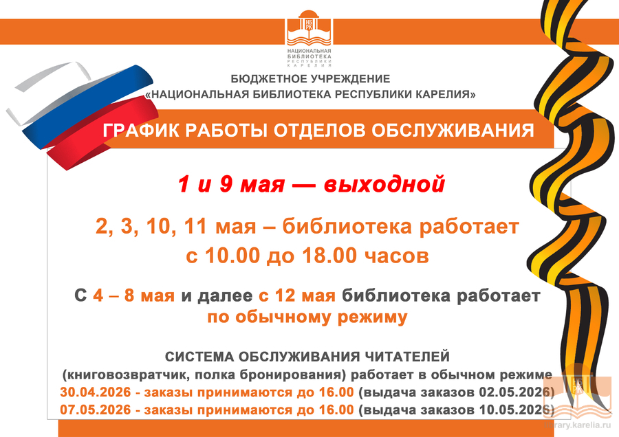 2, 3, 10, 11 мая – библиотека работает с 10:00 до 18:00