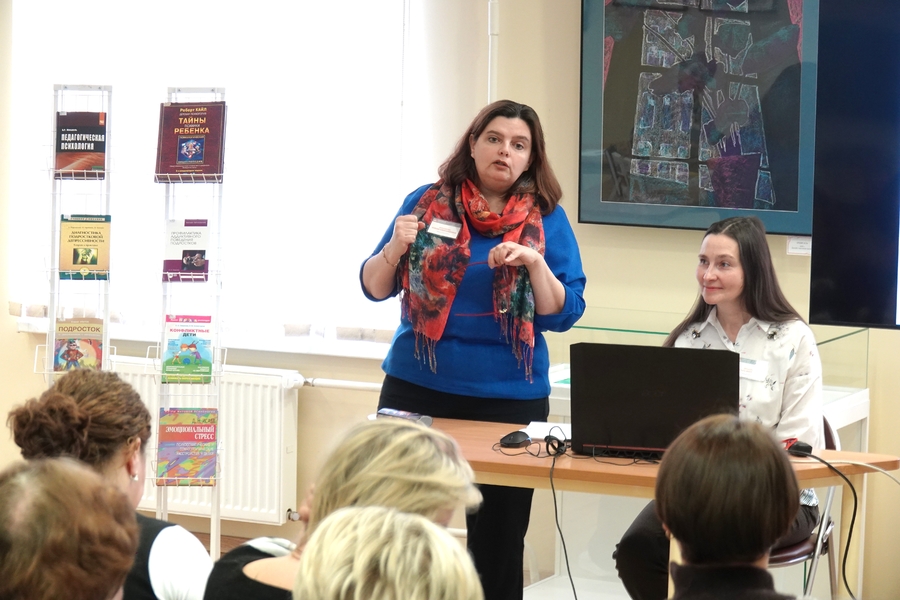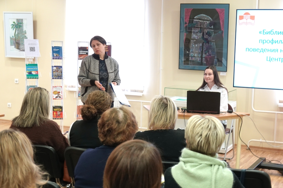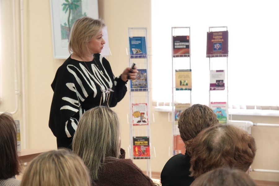 Главный библиотекарь Центра детского чтения Ольга Викторовна Михайлова выступила перед собравшимися с темой «Библиотека как пространство профилактики деструктивного поведения несовершеннолетних: опыт Центра детского чтения».