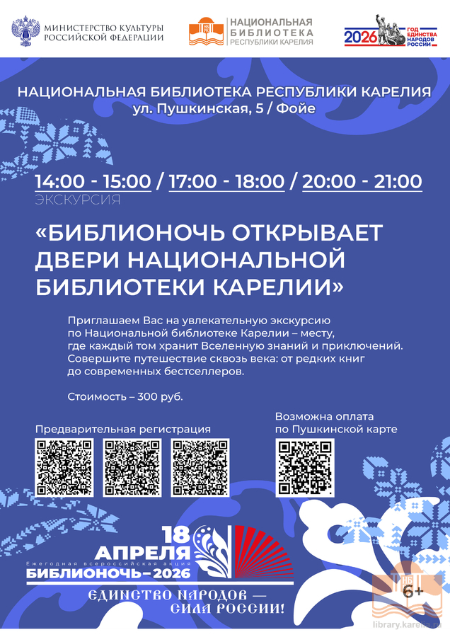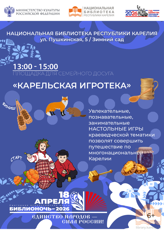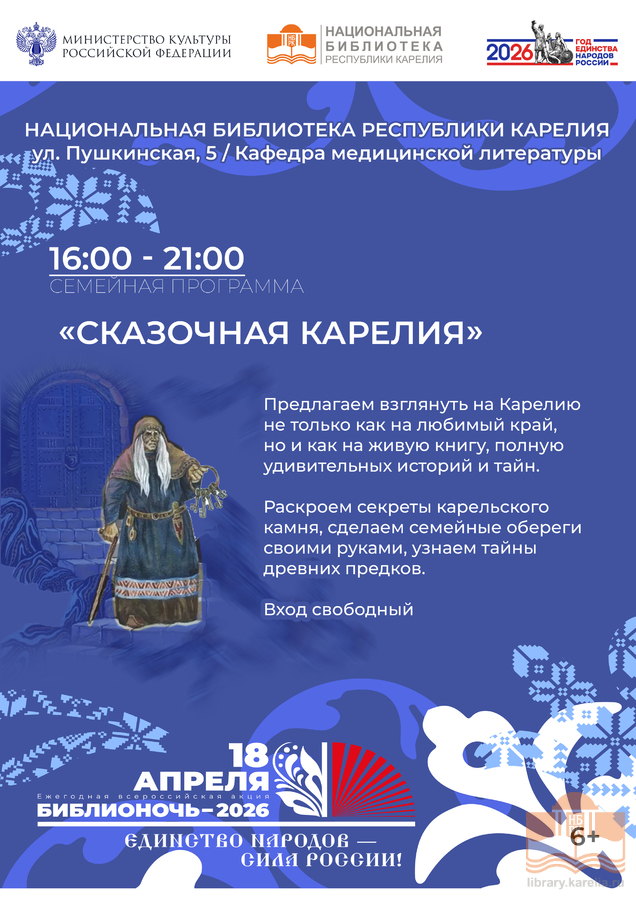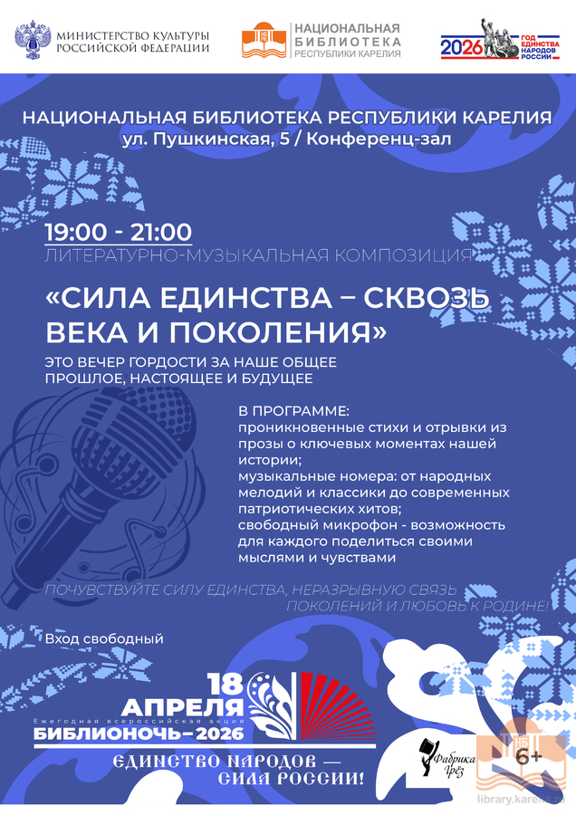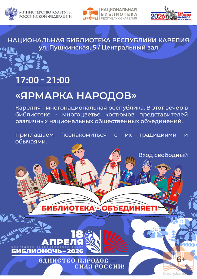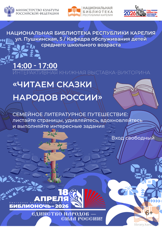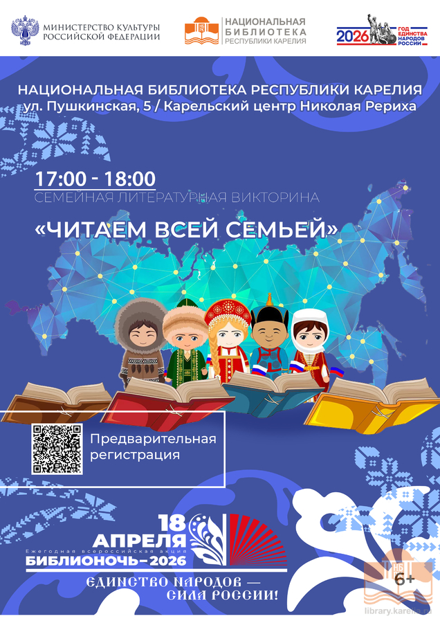 18 апреля 2026 года Национальная библиотека Карелии присоединяется к общероссийской акции «Библионочь-2026». Это ежегодное масштабное событие направлено на поддержку чтения и социальной значимости литературы как важнейшей части национальной культуры. Тема этого года – «Единство народов – сила России» – призвана подчеркнуть многообразие культур и единство нашей великой страны через призму литературы и библиотечных пространств.