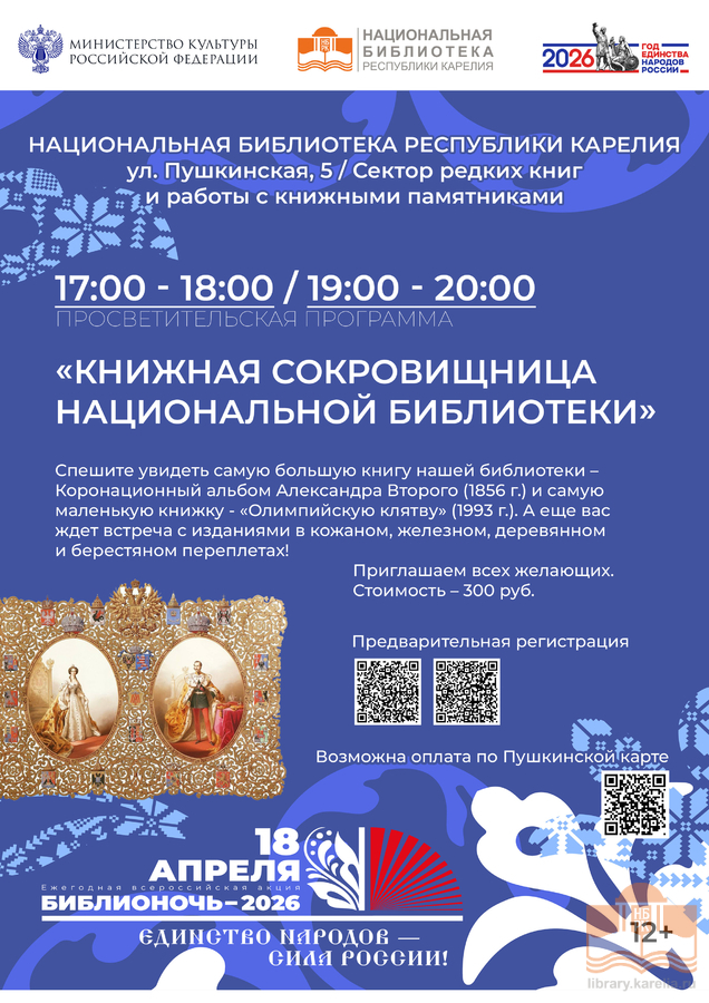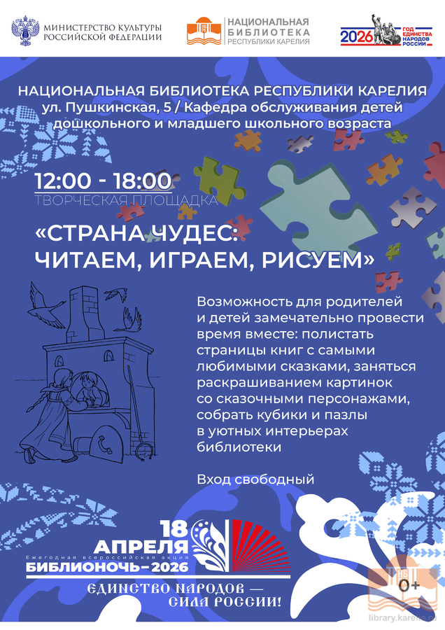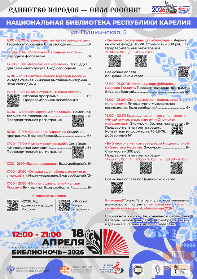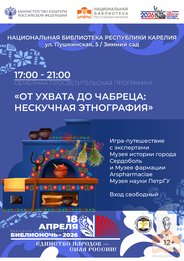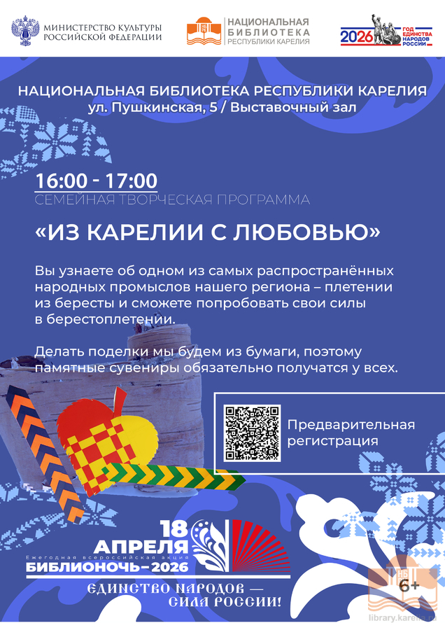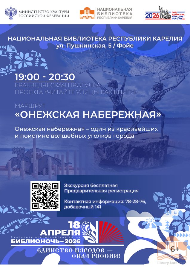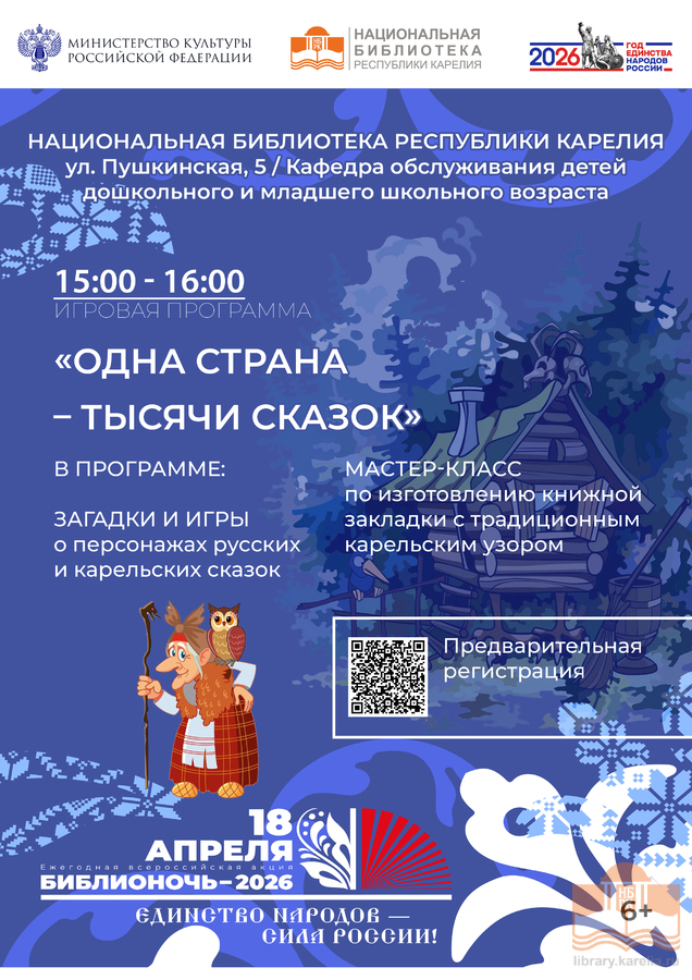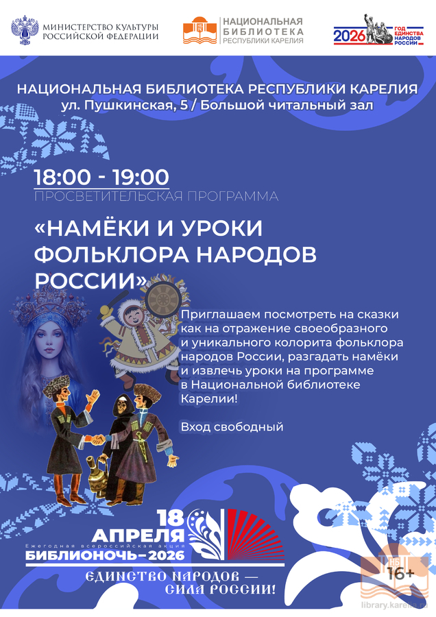 18 апреля 2026 года Национальная библиотека Карелии присоединяется к общероссийской акции «Библионочь-2026». Это ежегодное масштабное событие направлено на поддержку чтения и социальной значимости литературы как важнейшей части национальной культуры. Тема этого года – «Единство народов – сила России» – призвана подчеркнуть многообразие культур и единство нашей великой страны через призму литературы и библиотечных пространств.