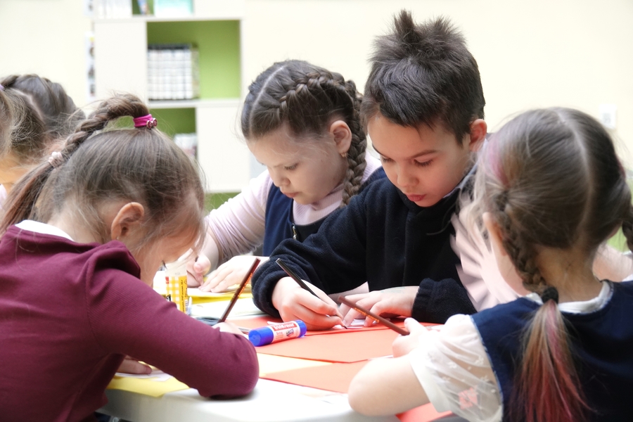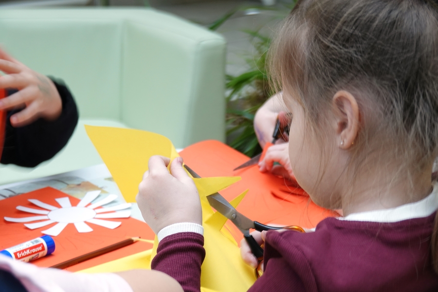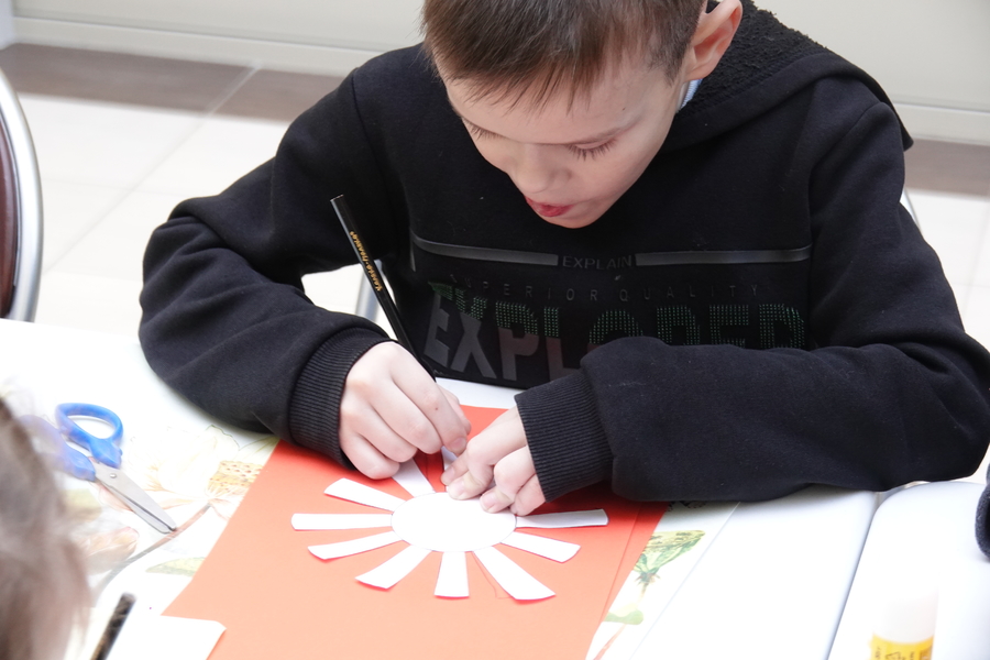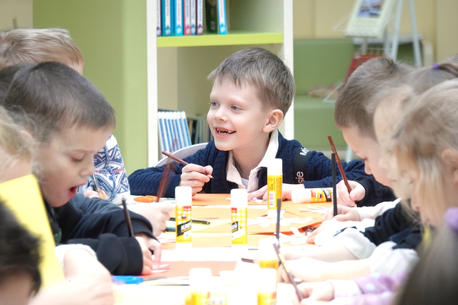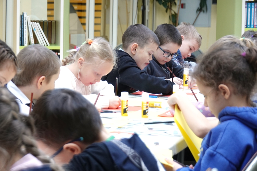 Занятие было посвящено теме Масленицы: ребята ознакомились с картинами русских художников Б.М. Кустодиева, В.И.Сурикова, К.Е.Маковского, изображающих масленичные гулянья. Благодаря книгам, представленным в книжной подборке на мероприятии, участники программы узнали об истории празднования Масленицы, её традициях, играх и забавах, о том, почему масленичный блин является не просто праздничным угощением, а символом золотого солнца. Ребятам был показан отрывок из фильма Государственного Русского музея «Реставрация картины К. Е. Маковского «Народное гулянье во время Масленицы на Адмиралтейской площади». Во второй части программы первоклассники изготовили своими руками главный символ Масленицы – яркое, веселое солнышко, олицетворяющее весну и тепло.
