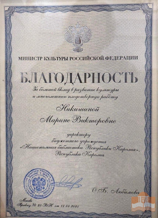 Марине Викторовне Никишиной, директору Национальной библиотеки Республики Карелия объявлена благодарность за большой вклад в развитие культуры и многолетнюю плодотворную работу.