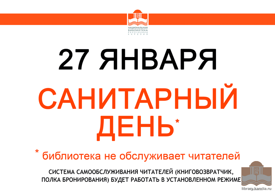 Уважаемые читатели! Напоминаем, что 27 января в Национальной библиотеке Карелии – санитарный день.