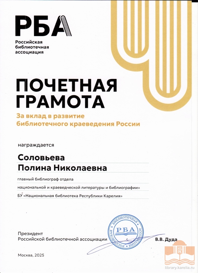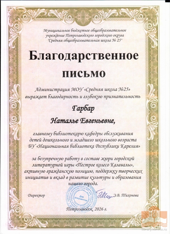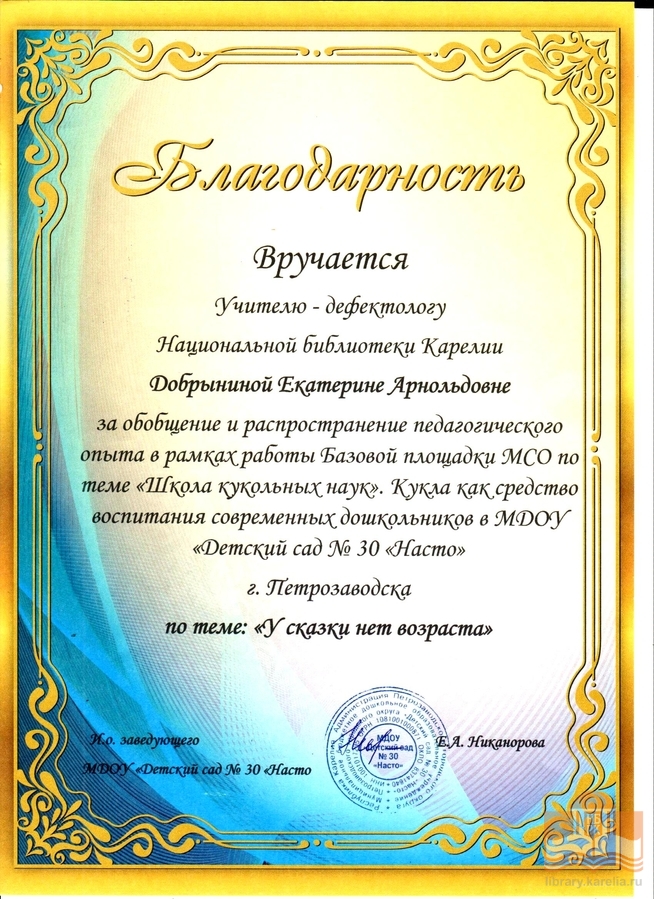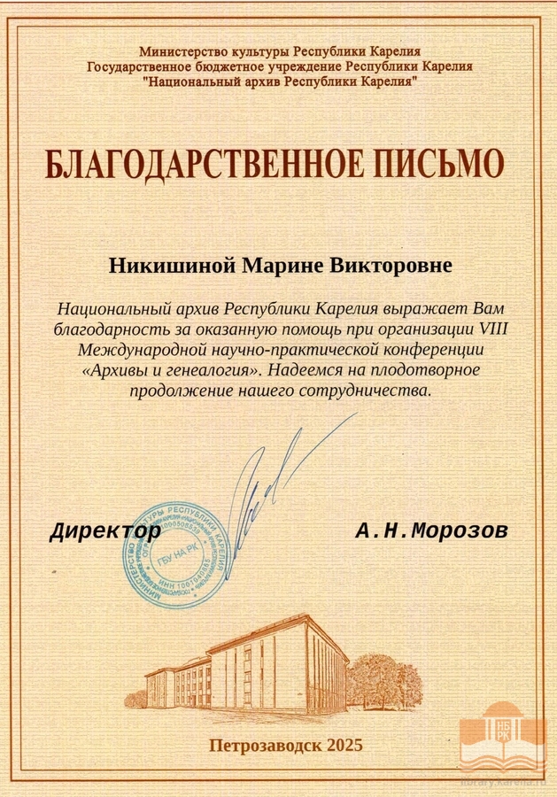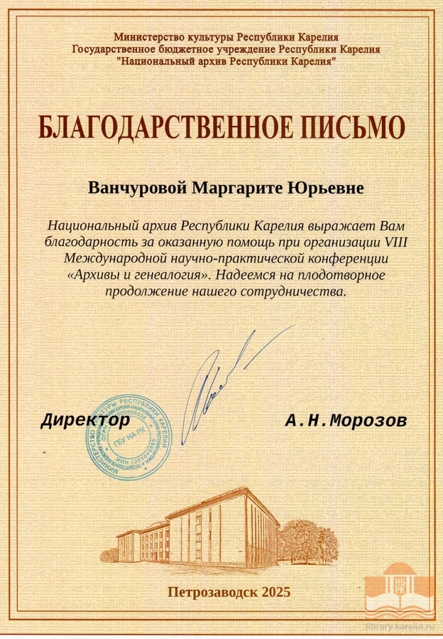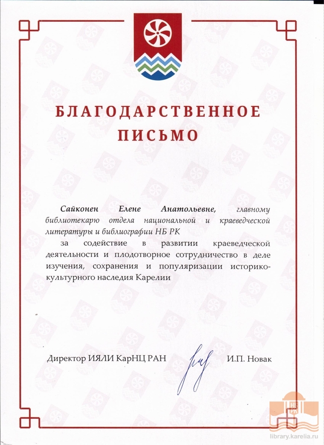 » Благодарности сотрудникам БУ «Национальная библиотека Республики Карелия»