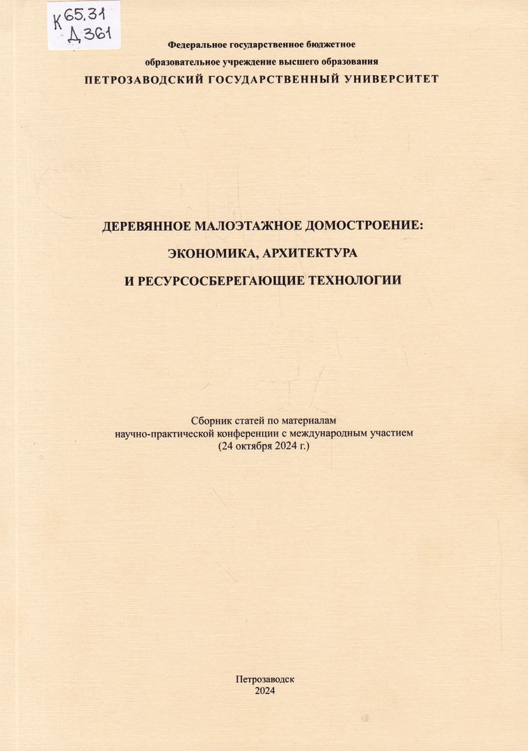 Д 361 Деревянное малоэтажное домостроение: экономика, архитектура и ресурсосберегающие технологии : сборник статей по материалам научно-практической конференции с международным участием (24 октября 2024 г.) / ответственные за выпуск: Никонова Ю. В. [и др.]. - Петрозаводск : Петропресс, 2024. - 148 с. : ил., табл. ; 21 см. - В надзаголовочных данных: Федеральное государственное бюджетное образовательное учреждение высшего образования Петрозаводский государственный университет. - Резюме на английском языке. - Дополнительный титульный лист на английском языке. - Библиография в конце статей. - ISBN 978-5-8430-0277-0. - Текст : непосредственный