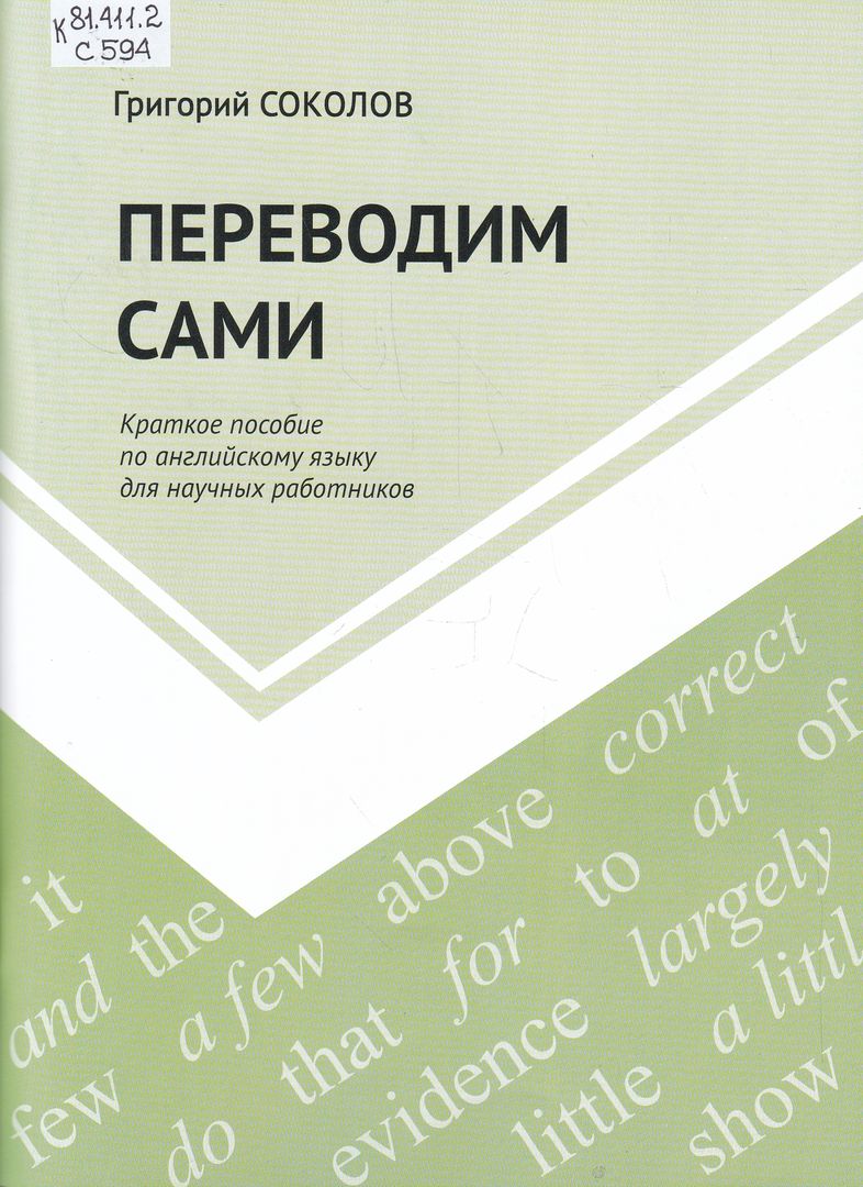 Переводим сами : краткое пособие по английскому языку для научных работников / Григорий Соколов ; Федеральный исследовательский центр "Карельский научный центр Российской академии наук", Институт геологии КарНЦ РАН. - Петрозаводск : Карельский научный центр Российской академии наук, 2025. - 81, [2] с. ; 21 см. - ISBN 978-5-9274-1005-7. - Текст : непосредственный