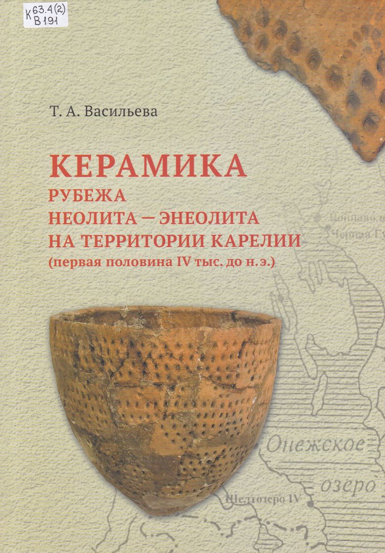 Керамика рубежа неолита - энеолита на территории Карелии (первая половина IV тыс. до н. э. / Т. А. Васильева ; научный редактор Н. В. Лобанова ; Федеральный исследовательский центр "Карельский научный центр Российской академии наук", Институт языка, литературы и истории Кар НЦ РАН. - Петрозаводск : Карельский научный центр Российской академии наук, 2024. - 238, [1] с. : ил., табл. ; 25 см. - Библиография: с. 101-107. - ISBN 978-5-9274-0996-9. - Текст : непосредственный