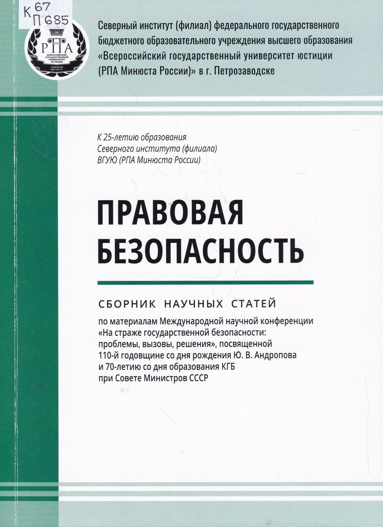 П 685 Правовая безопасность : сборник научных статей по материалам Международной научной конференции "На страже государственной безопасности: проблемы, вызовы, решения", посвященной 110-й годовщине со дня рождения Ю. В. Андропова и 70-летию со дня образования КГБ при Совете Министров СССР / редакционная коллегия: К. Л. Васин [и др.]. - Петрозаводск : Карельский научный центр Российской академии наук, 2024. - 234, [1] с. : ил. ; 21 см. - В надзаголовочных данных: Северный институт (филиал) федерального государственного бюджетного образовательного учреждения высшего образования "Всероссийский государственный университет юстиции (РПА Минюста России) в г. Петрозаводске. - На титульной странице: К 25-летию образования Северного института (филиала) ВГУЮ (РПА Минюста России). - Библиография в конце статей и в подстрочных примечаниях. - ISBN 978-5-9274-1004-0. - Текст : непосредственный