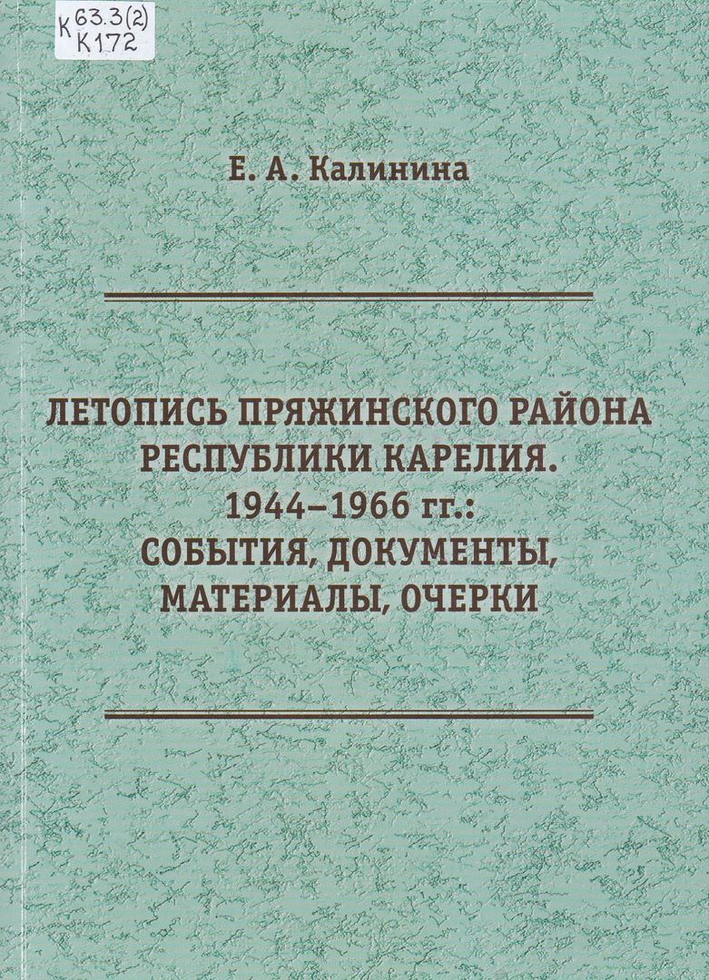 Летопись Пряжинского района Республики Карелия. 1944 - 1966 гг.: события, документы, материалы, очерки / Е. А. Калинина ; Федеральное государственное бюджетное образовательное учреждение высшего образования "Петрозаводский государственный университет". - Петрозаводск : Карельский научный центр Российской академии наук, 2025. - 422, [1] с., [8] л. фот. : ил. ; 20 см. - Библиография: с. 405-410 и в подстрочных примечаниях. - ISBN 978-5-9274-1007-1. - Текст : непосредственный