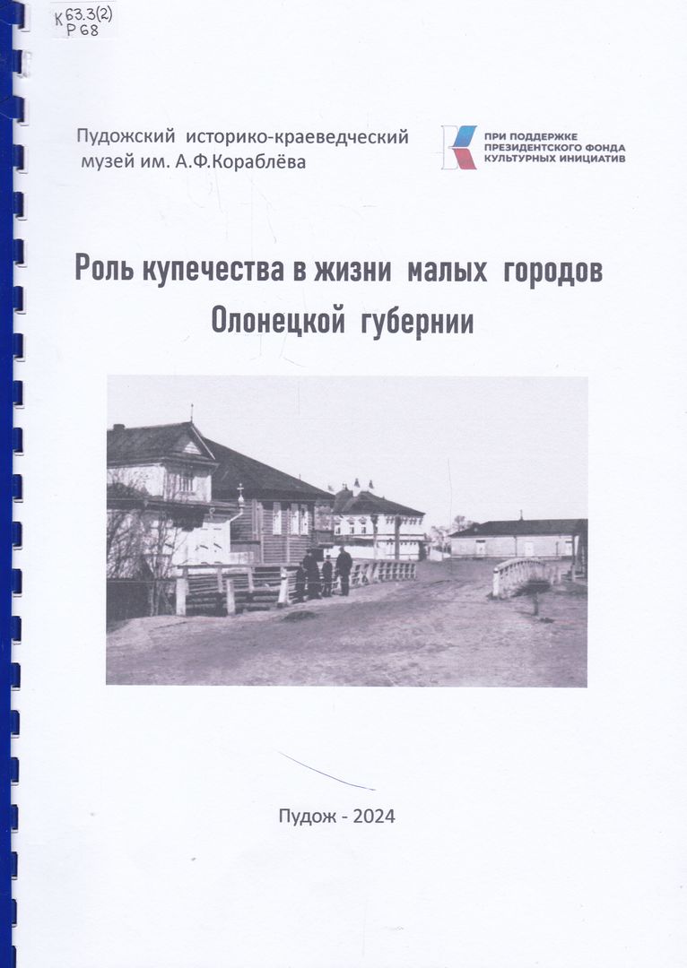 Р 68 Роль купечества в жизни малых городов Олонецкой губернии : [сборник статей] / Пудожский историко-краеведческий музей им. А. Ф. Кораблёва ; [руководитель проекта и составитель Зиновьева Е. В.]. - Пудож : Пудожский историко-краеведческий музей им. А. Ф. Кораблёва, 2024. - 58 с. : ил. ; 30 см. - Описано по обложке. Титульный лист отсутствует. - Библиография в подстрочных примечаниях. - Текст : непосредственный