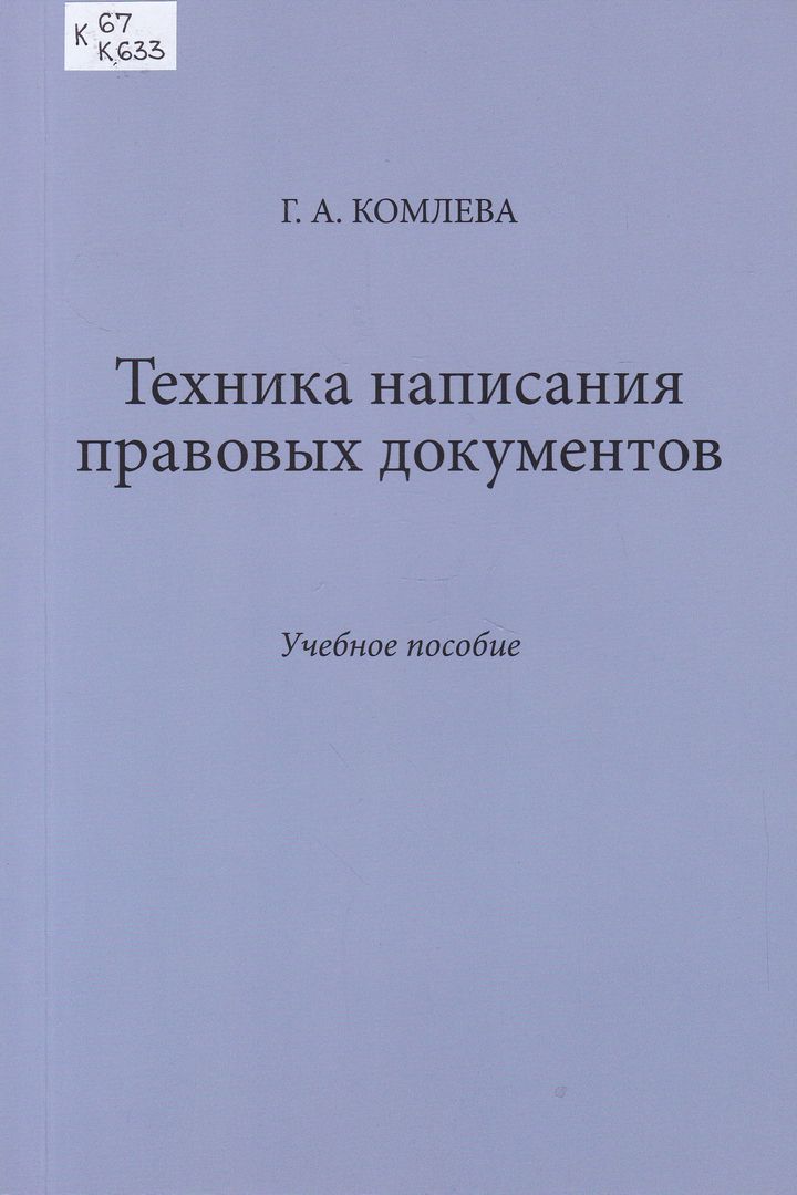 Техника написания правовых документов : учебное пособие : для студентов вузов по специальности "Юриспруденция" / Г. А. Комлева. - Петрозаводск : ВЕРСО, 2025. - 159, [1] с. ; 22 см. - На обороте титульного листа автор: Комлева Галина Анатольевна, кандидат филологических наук. - Библиография в конце книги и в подстрочных примечаниях. - ISBN 978-5-91997-493-2. - Текст : непосредственный